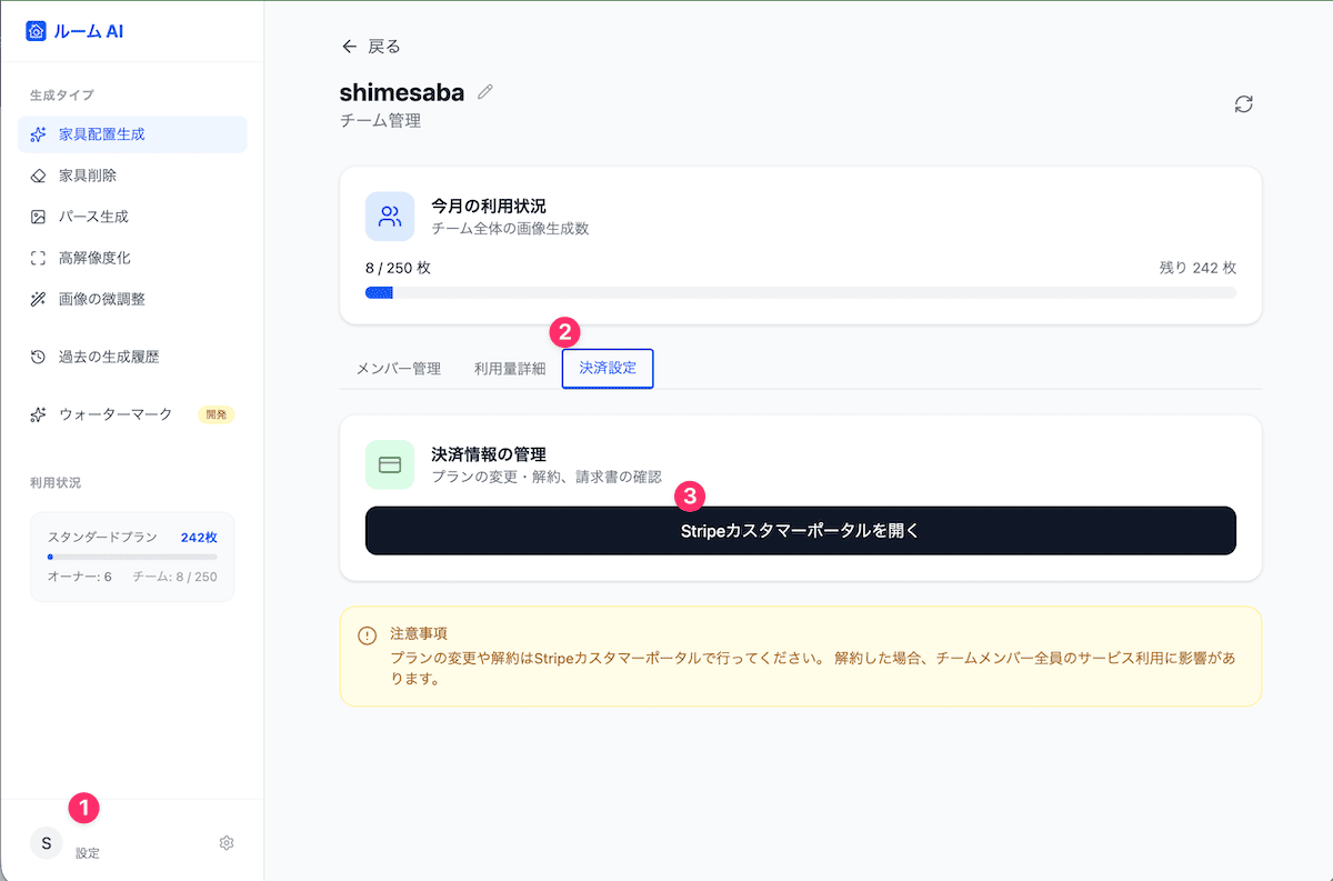 チームプランをご利用の場合は、チーム管理画面から「決済情報」を選択してください。
