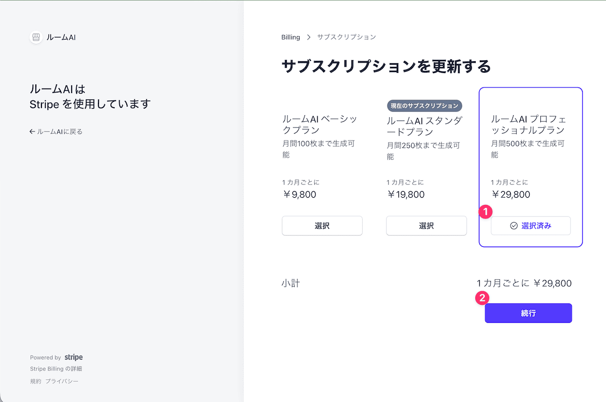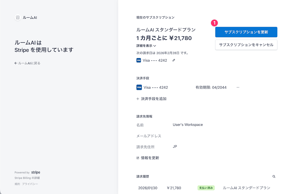 決済情報画面に表示されている「サブスクリプションの更新」ボタンをクリックします。