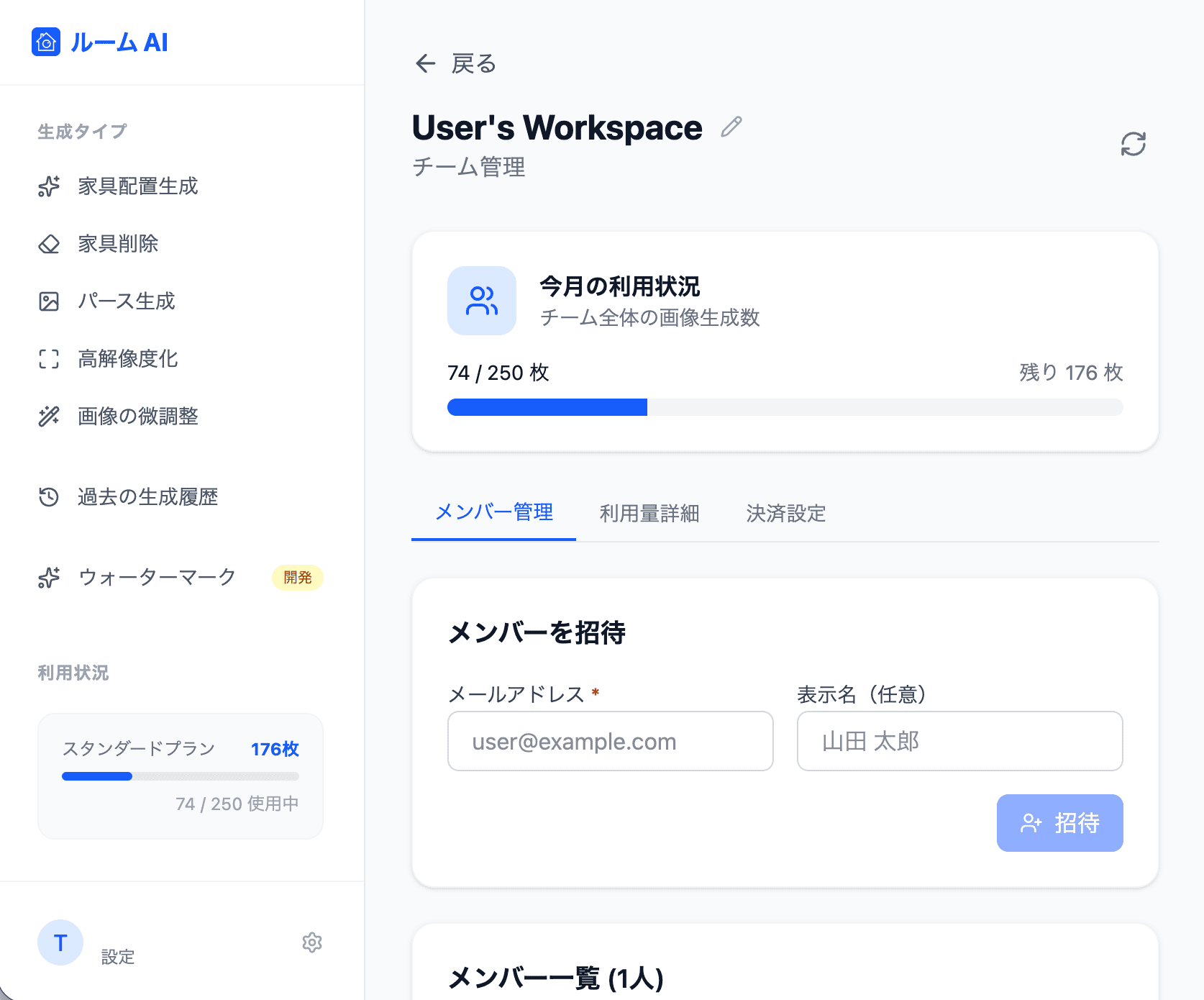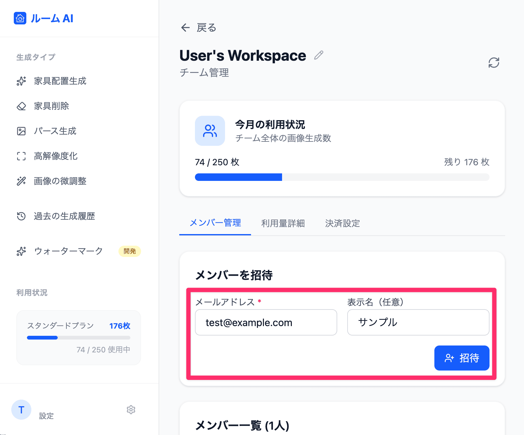 - 利用状況の確認: メンバーごとの画像生成枚数の確認